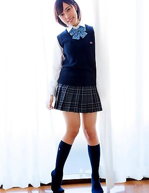 Сute Japanese girl Mari Hirose in a schoolgirl costume poses on the street and at home, exposing her shaved pussy and ass
