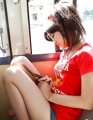 Asian cute Asian Apple takes off her shorts and strokes herself between her legs