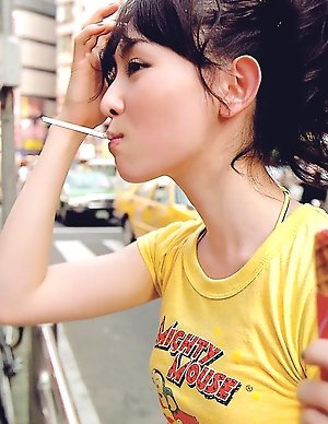 Rina Akiyama with sexy lips rubs her cunt of bar outdoor